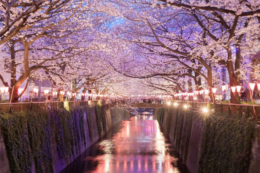Nakameguro, Tokyo’s most popular neighborhood to see cherry blossoms with its many streets lined with trees.