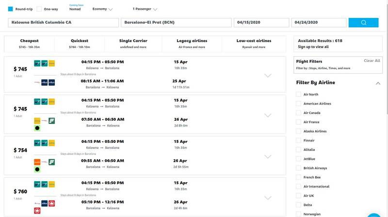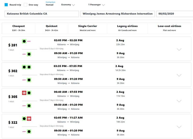 The next test was a FlyLine flight on an internal flight between Kelowna and Winnipeg, for a trip in the summer from August 2-9. FlyLine’s price was $281 USD with many options available for under $325.