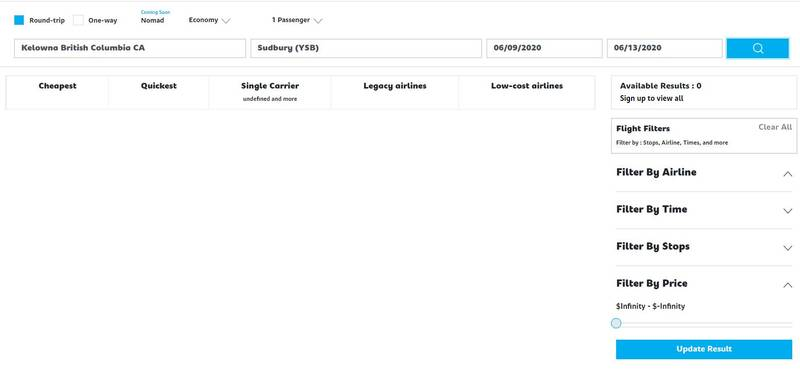 In order to check the prices between smaller airports and Canada, I checked prices from Kelowna, British Columbia to Sudbury (Ontario), where I plan to attend a June conference. FlyLine was unable to provide me with a price.